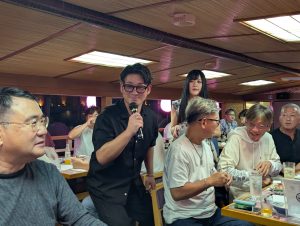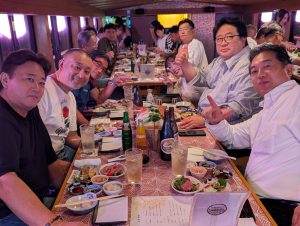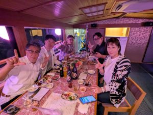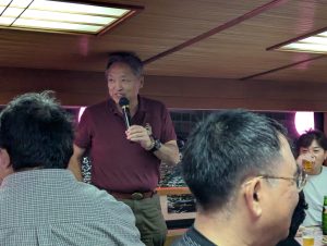 懇親会(例会)は屋形船あみ幸さんにて。前地区ガバナーの森亮介L.も加わり、サプライズで榊原さんの還暦祝いもあり、未来の昭島ライオンズクラブの話もあり、一同大いに熱く盛り上がりました。屋形船をバックに集合写真を撮り、三々五々夜の浅草へと消えていきました。